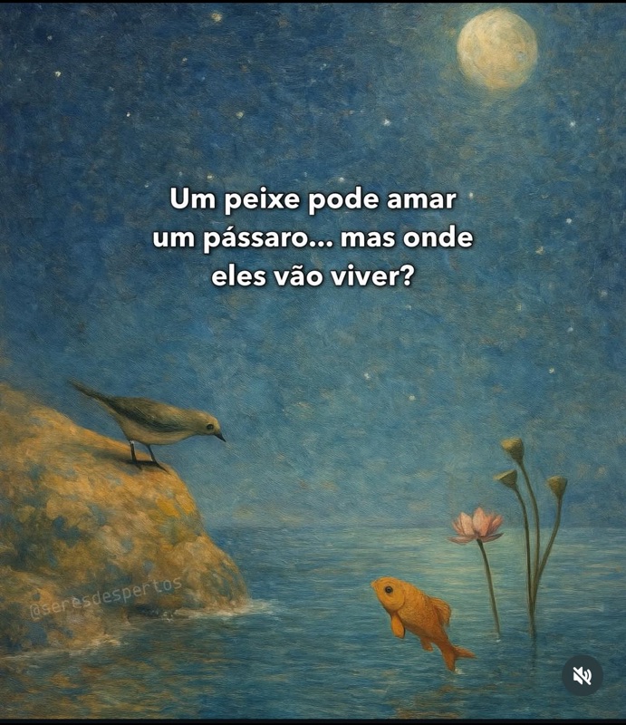 Essa pergunta atravessa silenciosamente muitas relações humanas. Não é a força do amor que está em jogo, mas aquilo que sustenta o amor. O pássaro respira o ar, o peixe respira a água. Cada um carrega um mundo inteiro inscrito no corpo, nas necessidades, na maneira de existir. Quando dois mundos assim se olham, nasce uma ternura imensa, mas também a impossibilidade.