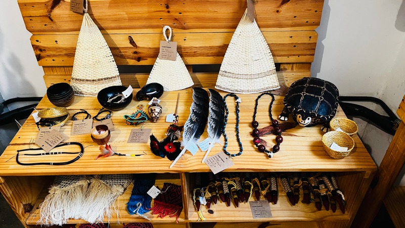 É um território pequeno, mas cheio de mundo, onde as etnias decidem que ali pode pousar sua arte, sua técnica, sua história. É um gesto político e afetivo. Não se trata de entrar e comprar “objetos indígenas”. Trata-se de encontrar colares, apitos, cestos, sementes, joias e trabalhos que cada povo produz como extensão da própria existência, sem retirar o sentido que carregam.